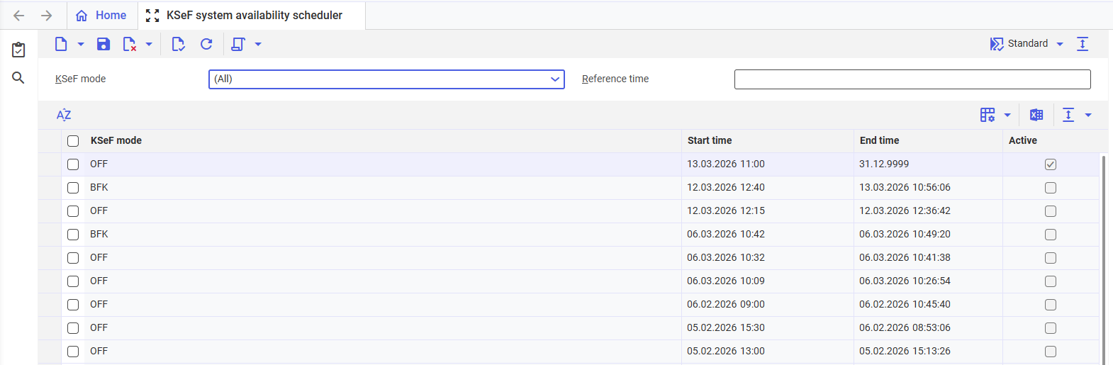 - Active — a selected parameter indicates the current KSeF unavailability period. The parameter is selected automatically based on the values entered in the Start time and End time