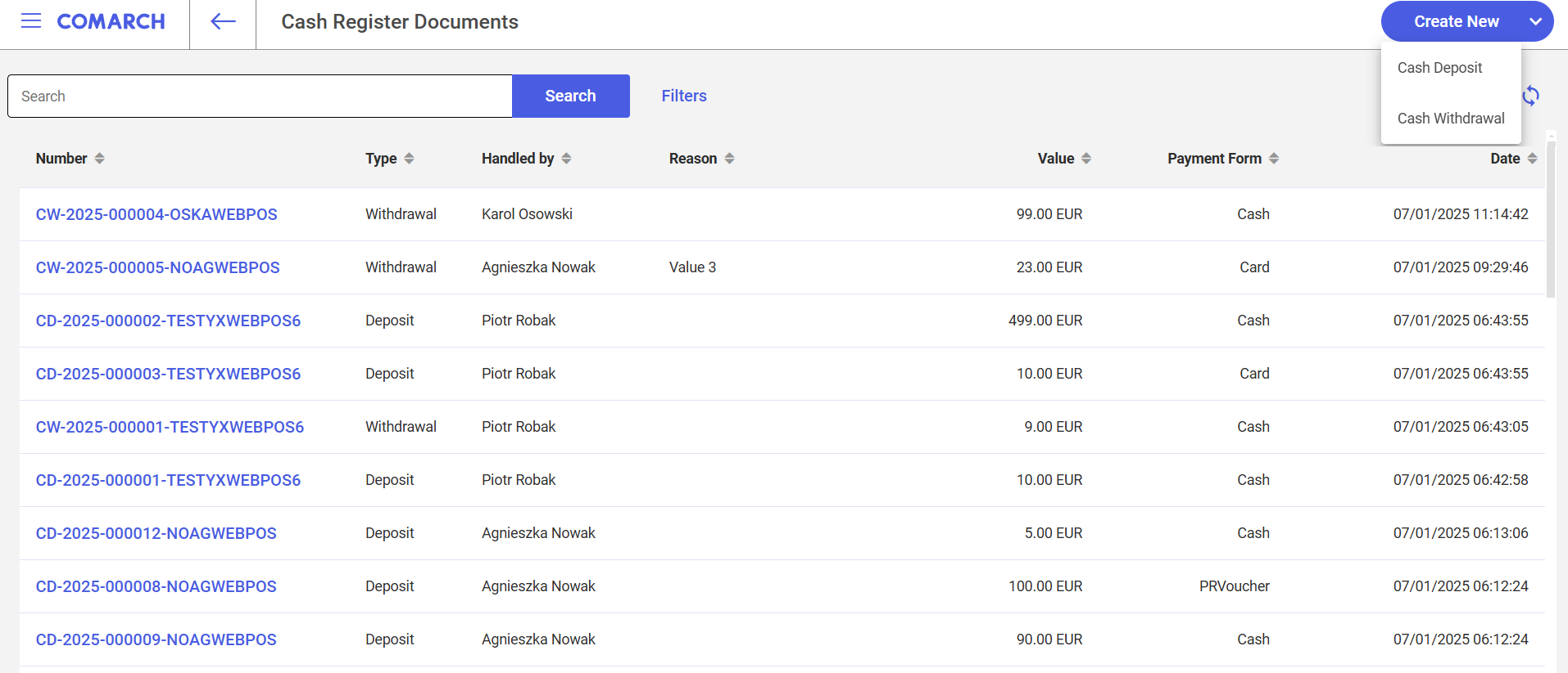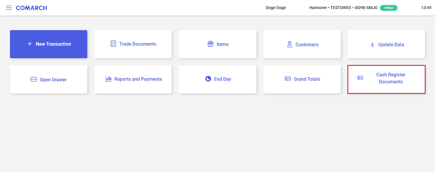 In order to open the list of deposit (CD) and withdrawal (CW) documents, select the [Cash Register Documents] tile in the main panel of the application.