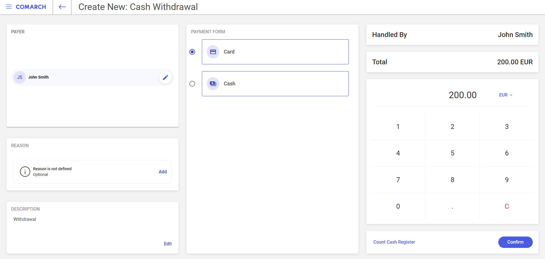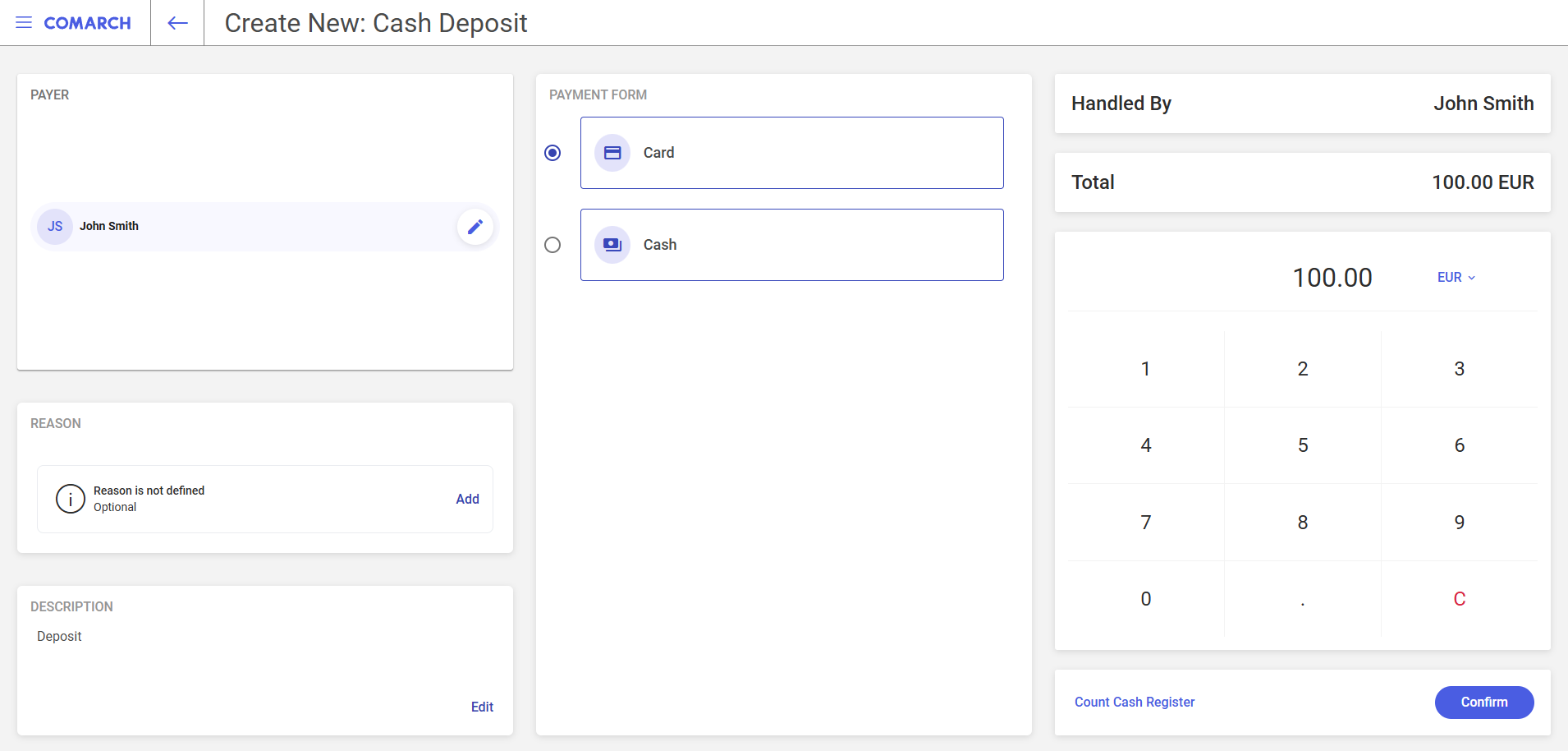 - Total – in this field, you can find the calculated transaction amount. If you use the [Count Cash Register] function, this field can be automatically filled in based on the total calculated in the Count Cash Register
