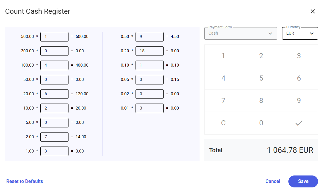 When counting the cash register balance in the Count Cash Register window, you can enter the number of individual banknotes and coins stored in the drawer. The application automatically calculates the value for each denomination (number × face value) and adds up all items, presenting the total cash in the drawer.
